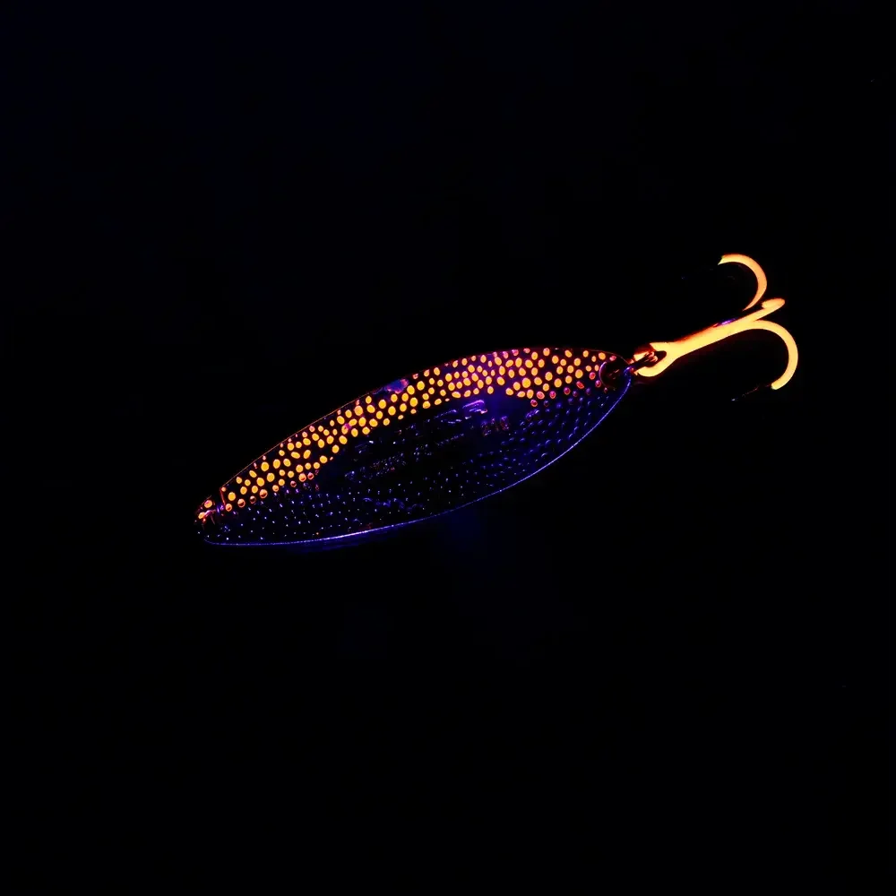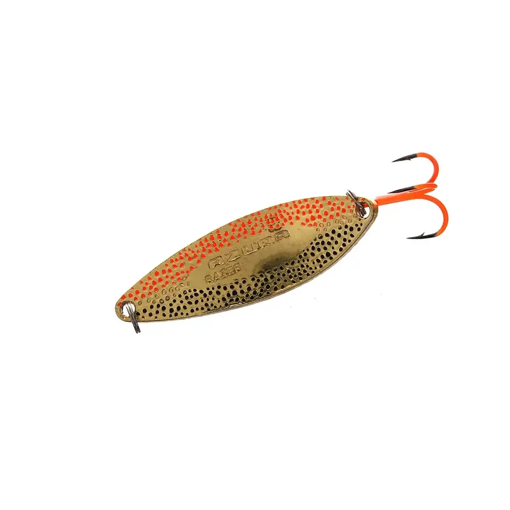 Блешні Azura Razer – серія висококласних коливних блешень довгастої звуженої форми, виготовлених із латуні. Завдяки своїй формі та унікальному профілю блешня Azura Razer має досить активну компактну гру, під час якої переважно працює її задня частина, що створює потужні низькочастотні коливання, привабливі для будь-якого хижака. Блешня створювалася для ловлі на швидких річках, тому чудово тримає течію, не спливає на поверхню та вирізняється високою стабільністю гри. Водночас затоки річок, озера, протоки та водосховища без течії також є вотчиною цієї приманки, яка збирає і тут багату данину! Приманка відмінно збалансована, чудово тримає глибину проведення і має неймовірні аеродинамічні характеристики, що дають змогу виконувати далекі та наддалекі закидання, тобто не лише працювати по площах, а й діставати до найобережнішої риби. Специфічна рельєфна зовнішня поверхня блешні не тільки робить привабливим її зовнішній вигляд, але і створює під час проведення мерехтливі відблиски та мікрозавихрення води, що викликають у хижих риб жвавий інтерес і провокують їх на миттєву атаку. Блешня дуже універсальна й демонструє феноменальні результати уловистості як на повільних і середніх, так і на високих швидкостях проведення. У списку її трофеїв щука, окунь, білизна, головень, судак, лосось та інші хижаки. Коливалки Azura Razer – чудовий приклад поєднання перевіреної часом японської класики та сучасних технологій. Приманки оснащені надійними завідними кільцями та найгострішими трійниками, доступні в широкому спектрі уловистих забарвлень, мають довжину 54, 58, 62 мм і вагу 14, 16, 21 г відповідно.