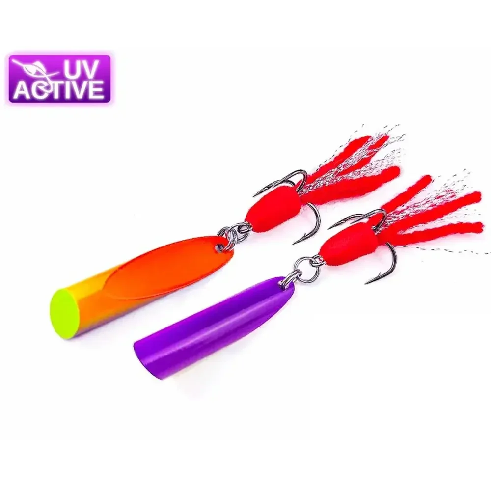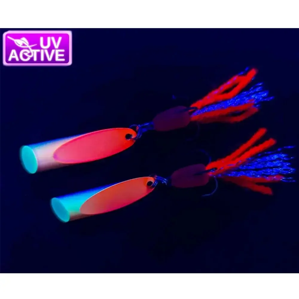 Зміщений центр ваги до нижньої частини, наділяє приманку неперевершеними польотними характеристиками. Трійник оснащений циліндром з матеріалу EVA, опушка у блешні комбінована з люрексу та вовняної нитки, завдяки цьому на паузах під час джигової проводки, трійник робить неквапливі, згасаючі рухи.
