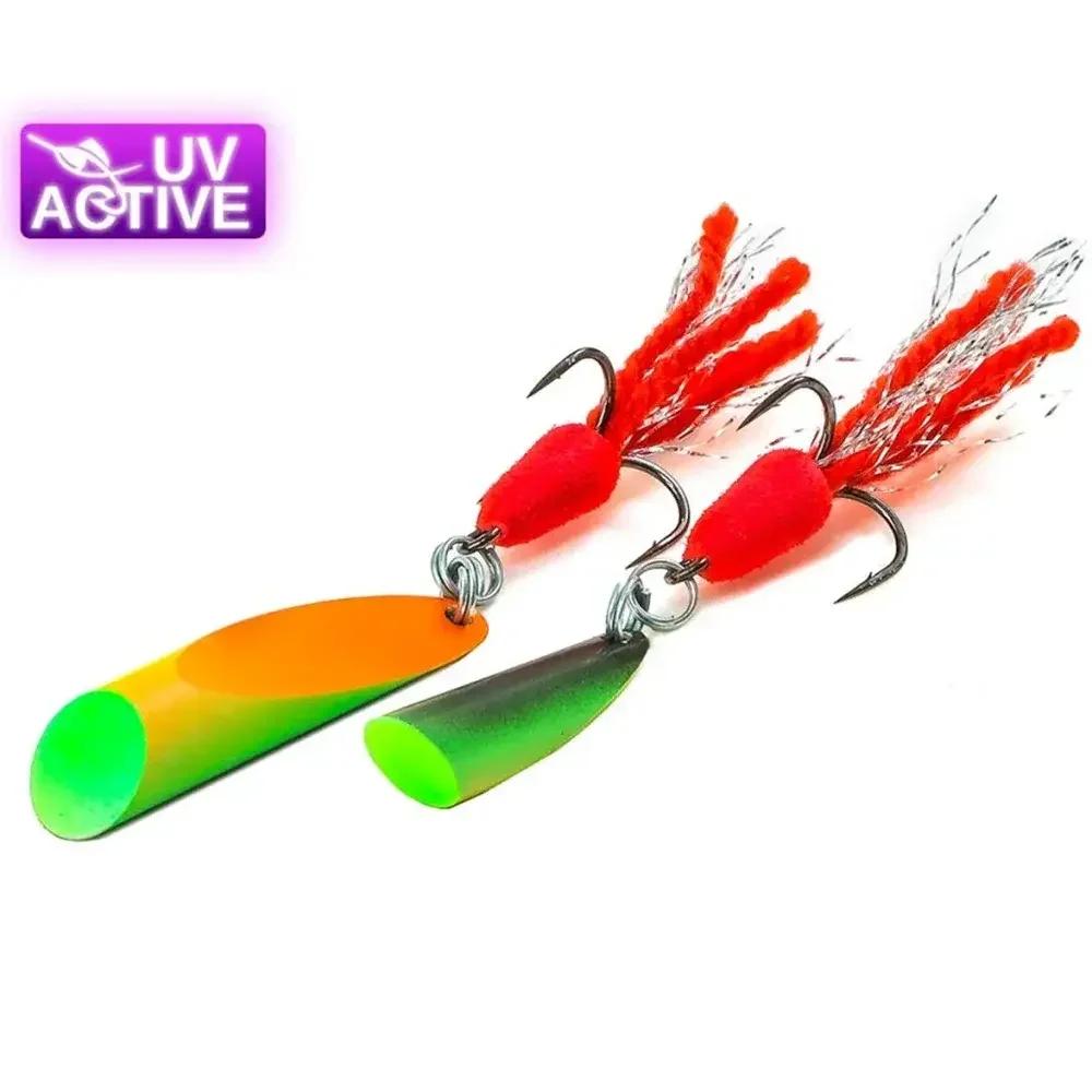 Зміщений центр ваги до нижньої частини, наділяє приманку неперевершеними польотними характеристиками. Трійник оснащений циліндром з матеріалу EVA, опушка у блешні комбінована з люрексу та вовняної нитки, завдяки цьому на паузах під час джигової проводки, трійник робить неквапливі, згасаючі рухи.
