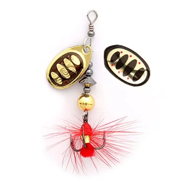 У блешнях Bonnie Blade використовуються два варіанти сердечника: набірний з кульками (#0, #1, #2) і циліндричний (#3, #4, #5). Bonnie Blade - нова серія обертових блешень Lucky John. У цих принадах використовуються сучасні конструктивні рішення, які забезпечують надійну і стабільну гру блешень, і, що найголовніше, роблять їх дуже привабливими для будь-якої хижої риби. Головний елемент блешень - обертається пелюстка. Він дуже легкий, зроблений з латуні і має гарні динамічними показниками при обертанні у воді, що дозволяє робити проводку приманки на мінімальній швидкості. Пелюстка «заводиться» відразу, як тільки блешня починає рух. Пелюстки пофарбовані з двох сторін. З якого б боку хижа риба не дивилася на приманку, її забарвлення залишається однаковою і привабливою, що підвищує інтерес до блешні і, в підсумку, призводить до результативній атаці. Важлива деталь - сердечник приманок, від якого залежить вага і дальнобойнос ть приманки, а також її стійкість у воді. У блешнях Bonnie Blade використовуються два варіанти сердечника: набірний з кульками і циліндричний. За рахунок основного кульки, центр ваги блешні зміщений в її хвостову частину, що збільшується далекобійність її дрібних моделей. Циліндричний сердечник більших моделей, виточений з латуні з поперечними канавками, які, без сумніву, посилюють як привабливість приманки, так і стабілізує її горизонтальне положення при русі у воді. Металеві шарікіподшіпнікі і конусотражатель призначені для легкого обертання пелюстки на осі і перешкоджають його «залипання». Жорстка дужка кріплення пелюстки, виконана зі сталевої розклепаною і просвердленої по торцях дроту, забезпечує йому повну свободу обертання при мінімальному терті з віссю приманки. На всіх трійниках пов'язана яскрава мушка, основне призначення якої - зняти останні сумніви у приготувалася до атаки хижої риби. Також мушка грає роль стабілізатора горизонтальної стійкості. Основа блешні - нержавіюча вуглецева дріт. Її вісь, в екстремальних ситуаціях, нічого очікувати деформуватися, і приманка завжди буде знаходитися в працездатному стані. Шість розмірів і вісім кольорів дозволяють підібрати необхідну приманку практично для будь-яких умов лову спінінга окуня, щуки, форелі або лосося.