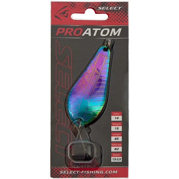 Блешня Select ProAtom - коливалка дуже популярної форми, яка часто використовується для лову щуки. Завдяки своїй унікальній власній грі на рівномірній проводці вона добре ловить не тільки "зубасту", але й іншу хижу рибу. Для того, щоб досягти успіху, достатньо проводити блешню в середньому темпі, при цьому вона стабільно приноситиме результат. Хоча доповнення пауз та різних ривків допоможуть привнести різноманітність у гру та збільшити кількість клювань. Блешня Select ProAtom випускається масою 15 грамів та рекомендована для риболовлі на глибинах 1.5-2.5 метра.