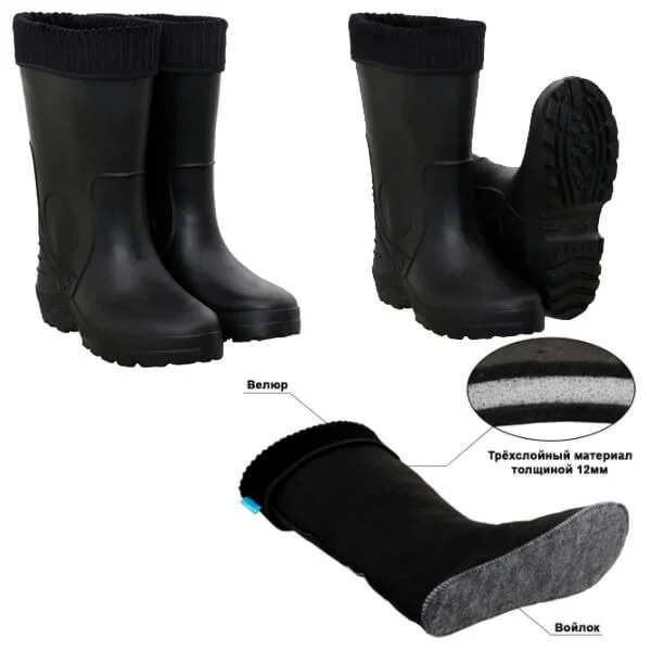 Неймовірно міцні, легкі та теплі чоботи Flagman із Eva з панчохою в комплекті. Даному виду взуття немає рівних у носінні в холодну та мокру погоду. Панчоха товщиною 12 мм складається з трьох шарів тканини, має повстяну підошву і тим самим тривалий час зберігає тепло. До того ж, на ньому зверху є еластична манжета з велюру, що перешкоджає проникненню всередину чобота дощу або снігу. Матеріал, який використовується для виготовлення цієї моделі – гіпоалергенний Eva. Такі чоботи мають низький рівень тепловіддачі (ефект термоса), не вбирають вологу і завдяки пористій структурі мають чудові амортизуючі властивості. Призначені для риболовлі, мисливства чи активного відпочинку в суворих погодних умовах. Температурний режим -20°С.