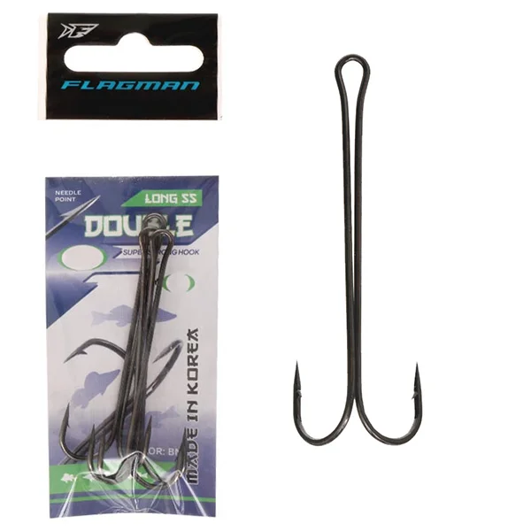 Популярність підвійних гачків завжди була чималою у рибалок. Їм віддають перевагу любителі лову на живця або на штучні приманки. І це не випадково! На відміну від трійників підвійні крючки у меншій мірі травмують живця, оснастки на їх основі монтуються легше, а зачепистість при підсіканні риби дуже хороша. На основі двійників швидко та легко монтуються практично будь-які м'які пластикові приманки (твістери, віброхвості, черви та ін.), а також поролонові та поліуретанові рибки, приманки на основі ялинкової мішури, шерсті тощо. Двійники із довгою цівкою Flagman Double Hook Long SS виготовлені в Кореї. Гачки володіють високою якістю і задовольняють найжорсткіші вимоги. Серія відрізняється довгою кованою цівкою, а також надгострим жалом, що гарантує відмінну зарубку. Гачок не спаяний, тому його можна злегка розігнути для більш зручного оснащення силікону. Форма крючка і гострота жала зводять до нуля ймовірність сходження риби під час виваження окуня, судака або щуки. До того ж гачок має високоякісне, антикорозійне покриття з нікелю. Темне нікелеве покриття не тільки робить крючок малопомітним у товщі води, але й надійно зберігає його від іржі. Залежно від габаритів хижака, на якого планується полювання, можна підібрати подвійний крючок потрібного розміру.