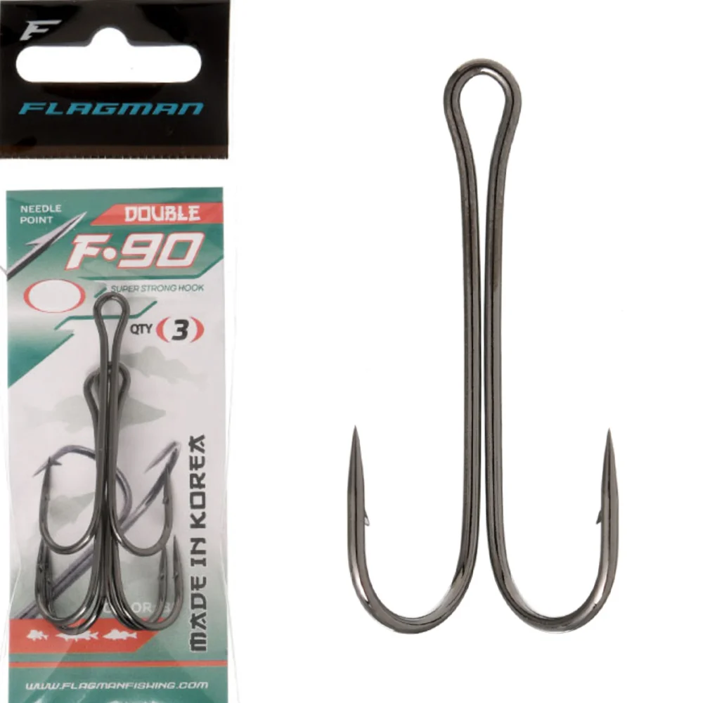 Flagman Double Hook F-90 – серія потужних подвійних гачків з довгою цівкою, яких виготовлено у Кореї. Гачки Flagman F-90 мають високу якість і задовольняють найжорсткіші вимоги сучасної риболовлі. Серію характеризують подовжена цівка, високоякісне антикорозійне покриття темного кольору, а також надгостре жало із заточкою Needle Point, що гарантує надійне засікання риби, яка клюнула. Гачок не спаяно, тому для більш зручного оснащення м'якої пластикової приманки його можна трохи розігнути. Форма Double Hook F-90, його гостре жало й чіпка борідка зводять нанівець імовірність сходження риби під час виважування. Розмірний ряд гачків цієї серії дозволяє легко підібрати найліпшу модель у залежності від типу снасті, розмірів приманки або наживки, а також величини очікуваної здобичі.