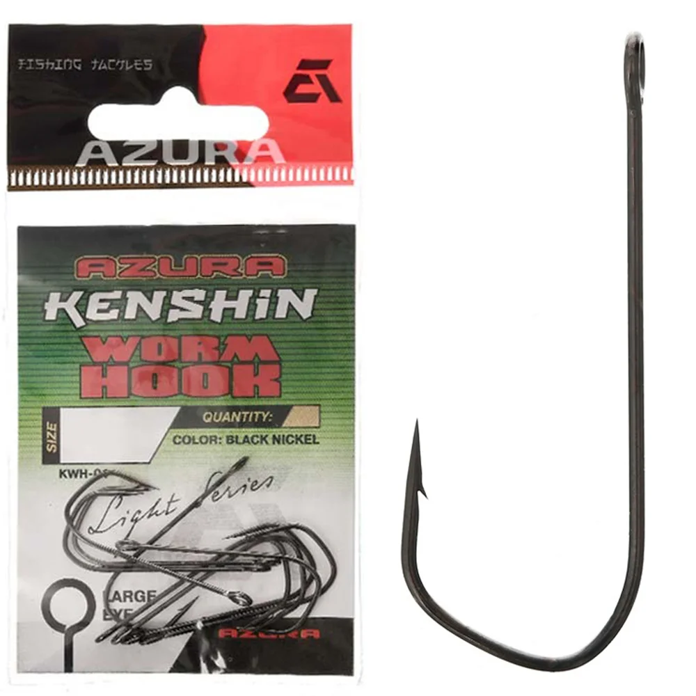 Azura Kenshin Worm Hook light series - серія одинарних гачків зі збільшеним вушком, які призначено для використання в шарнірних та інших спінінгових монтажах. Незважаючи на те, що гачки Azura Kenshin Worm виготовлено з тонкого дроту, вони мають високу надійність і міцність на розгинання. Гачки мають довгу цівку, кований піддів спеціальної форми, надгостре жало із заточуванням Needle Point, що гарантує надійне засічення риби, і високоякісне антикорозійне покриття Black Nickel. Спеціальна форма вигину не дає змоги м'якій приманці ковзати цівкою, надійно фіксуючи її на гачку. Ідеально підходять для оснащення м'яких приманок різних типів. Широкий розмірний ряд Azura Kenshin Worm Hook дає змогу підібрати оптимальний за розміром гачок майже під будь-яку м'яку приманку.