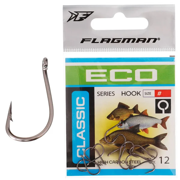 Flagman Classic 4 – серія якісних універсальних гачків із кільцем, призначених для широкого кола рибалок. Гачки Flagman Classic 4 мають класичний загин, широкий піддів, середньої довжини цівка з відігнутим назовні кільцем для прив'язування та пряме жало з лазерним заточуванням. Гачки серії Classic 4 характеризуються чудовою зацепистістю та відмінною реалізацією клювань. Виготовлені із міцного сталевого дроту з якісним антикорозійним покриттям Black Nickel. Ідеально підійдуть як для фідерного, так і для лову поплавця риби на об'ємні насадки рослинного і тваринного походження. Найгостріше жало і зачеписта борідка гарантують ефективне підсікання і впевнене утримання риби, що клюнула. Залежно від величини передбачуваного видобутку та оснащення, ви зможете легко підібрати гачки необхідного розміру. Доступні у розмірах № 8, 10, 12, 14, 16, 18. В упаковці – 10 шт.