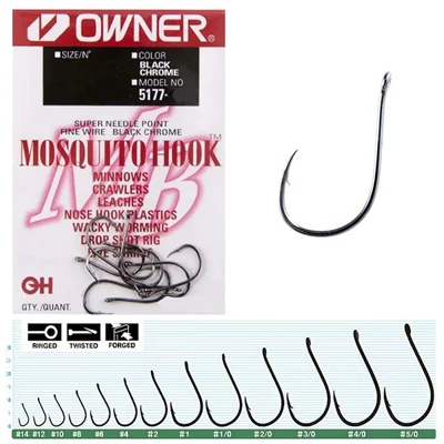 Owner Mosquito Hook 5177 - серія одинарних гачків, спеціально розроблена для спінінгової ловлі різноманітними повідцевими оснащеннями типу дроп-шот (drop shot), віки (wacky) тощо. Також крючки неплохо зарекомендували собі у фідерній, поплавцевій риболовлі, а також ловлі на живця. Owner 5177 виготовлені з міцної високовуглецевої сталевої проволоки. Owner Mosquito Hook характеризуються округлим загином, кованим піддівом, середньої довжини цівкою, злегка відігнутим усередину і вбік жалом, стійким до корозії захисним покриттям чорного або червоного кольору. Надгостре жало з ідеальним заточуванням, звичайної величини борідка гарантують ефективне підсікання та утримання будь-якої риби, що клюнула. Випускаються у широкому спектрі розмірів.