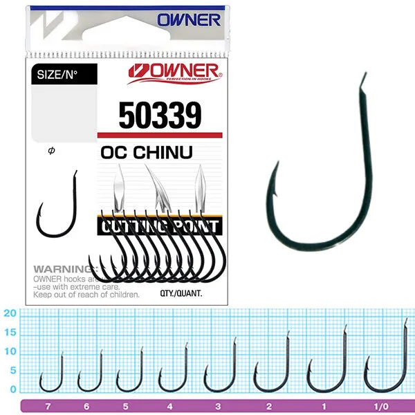 Owner Cut Chinu 50339 - серія надійних і потужних гачків, виготовлених з високоякісної вуглецевої сталі. Гачки Owner 50339 мають круглий загин, кований піддів, злегка відігнуте в сторону жало, нормальної довжини цівку зі зручною для прив'язування лопаткою і захисне покриття чорного кольору. Owner Cut Chinu вдало використовуються в донних і поплавцевих оснащеннях для лову великої риби на об'ємні насадки. Надгостре жало з ексклюзивним заточуванням Cutting Point і акуратна борідка гарантують ефективну підсічку і впевнене утримання будь-якої риби, що клюнула.