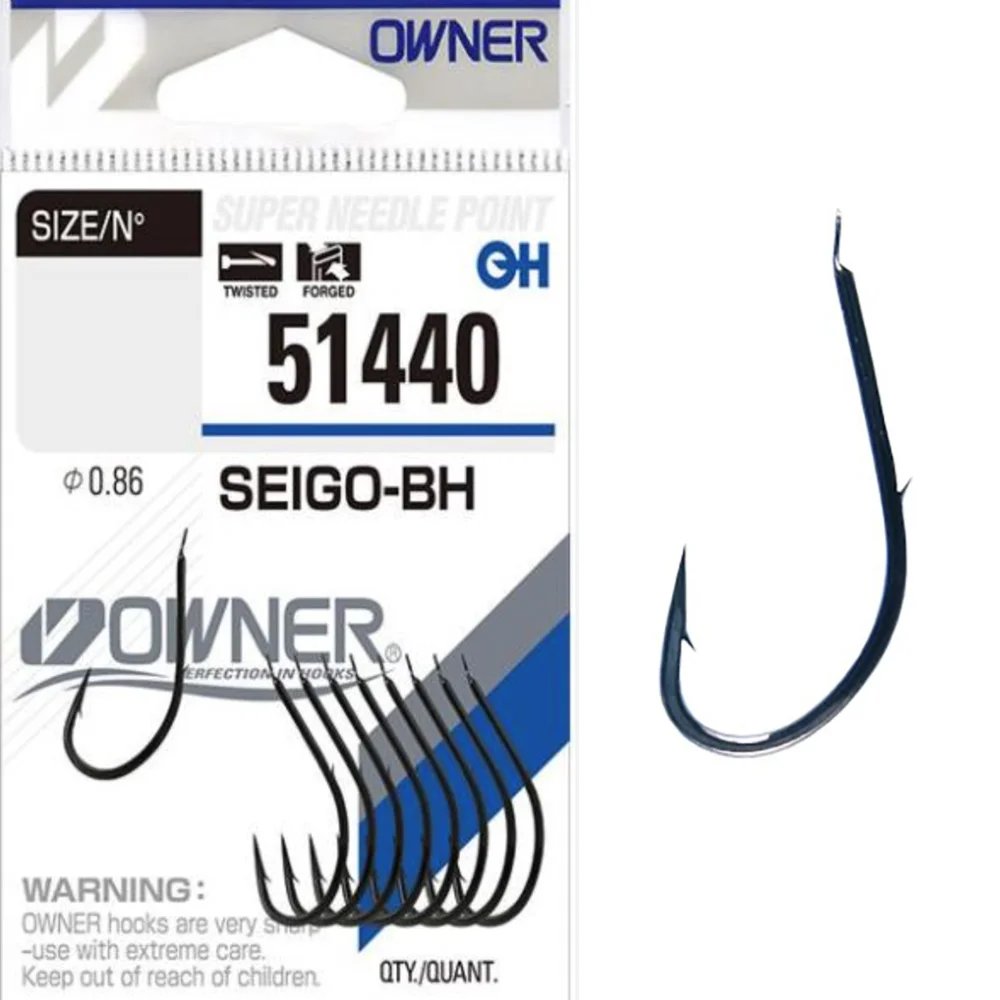 Owner Seigo BH 51440 - серія потужних і міцних гачків, виготовлених з високоякісної вуглецевої сталі. Гачки Owner 51440 мають напівкруглий загин, кований піддів, злегка відігнуте в сторону жало, нормальної довжини цівку з невеликою насічкою, зручну для прив'язування жилку лопатку і захисне покриття чорного кольору. Owner Seigo BH призначені для ловлі великої риби. Вдало використовуються у різноманітних донних і поплавцевих оснащеннях для ловлі на насадки як тваринного, так і рослинного походження. Найгостріше жало з заточкою Super Needle Point і класична борідка гарантують ефективну підсічку і надійне утримання будь-якої риби.