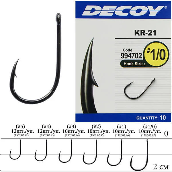 Decoy KR-21 – високоякісні гачки, які знайдуть своє застосування у різних видах лову. Товщина дроту підібрана таким чином, що гачки не виглядають грубими і мають достатню міцність для того, щоб боротися з досить великою рибою. Жало гачка трохи підігнуте всередину, що позитивно позначається на виведенні і запобігає сходам риби. одяганні її на гачок. Застосовуються в поплавцевій, фідерній та короповій риболовлі при лові будь-якої білої риби, у тому числі і невеликого коропа. Можливе також застосування гачків даної серії при лові щуки на живця.
