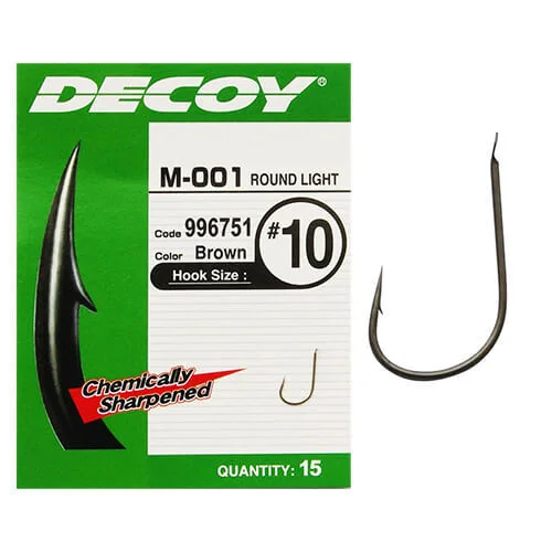 Decoy M-001 - серія легких гачків для лову білої риби як на живі, так і на рослинні приманки. Маючи низьку вагу, вони не навантажують наживку і рибі не складе особливих труднощів заковтнути її. Оснащені лопаткою, яка при правильному затягуванні вузла не перетирає тонкі волосіні. Висока якість гачків дозволяє використовувати їх у поплавці та фідерному лові не тільки на звичайних рибалках, але і в умовах змагань.
