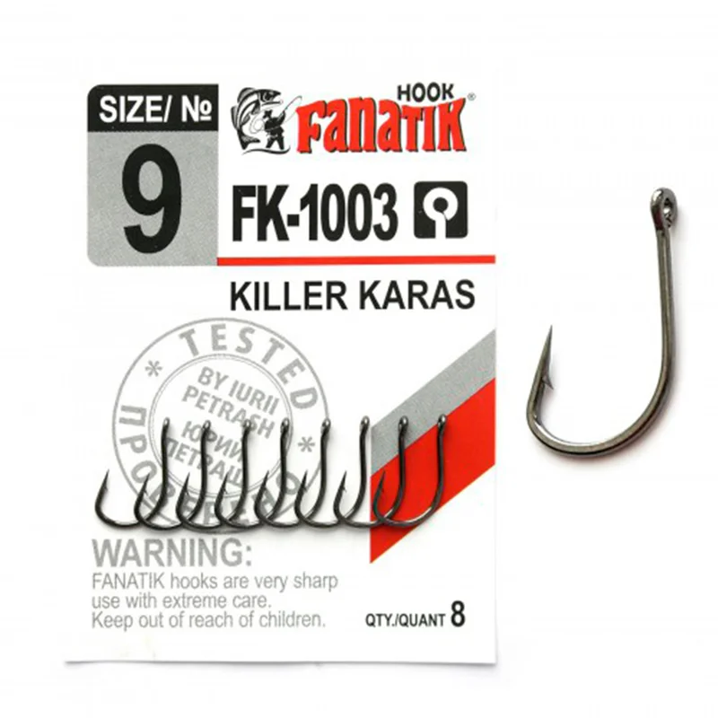 У цього гачка досить кровожерна назва - але як бути, якщо вона повністю відображає неймовірну ефективність такої форми саме для лову карася? Якщо ви захоплюєтеся цим простим і видобутливим полюванням, якщо використовуєте уловисте оснащення «Вбивця карася» і постійно стежте за тим, щоб гачки залишалися в ідеальному стані, завжди тримайте під рукою упаковку FK-1003 Killer Karas. Перевіряйте гостроту своїх гачків перед кожною рибалкою - і, якщо один із них затупився, не намагайтеся його наточити. При дешевизні і доступності гачків від ТМ Fanatik набагато простіше замінити гачок, що вийшов з ладу, новим, чия гострота ідеальна. Зацепистість цього тоненького жала, що дає максимум шансів на самозасічку риби, що клюнула, забезпечена цілим комплексом конструктивних і технологічних рішень. Вивірена форма: підгин у бік кільця покращує засікання, порівняно з моделями, у яких стискало паралельно цівкою. Чудовий пружинний дріт зі сталі VHI-Carbon правильно загартований і має антикорозійне покриття. Дрібниц тут немає: навіть темний колір гачка важливий, він допомагає замаскувати його в насадці навіть у тому випадку, коли частина цівки видно рибі.