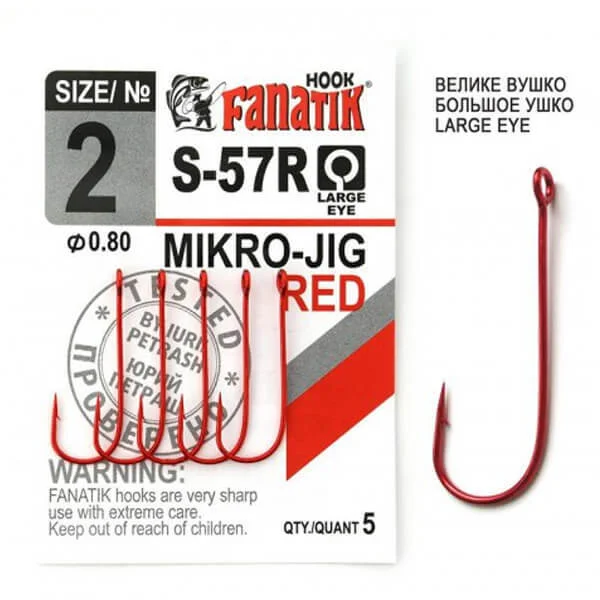 Одинарные крючки Fanatik S-57 RED производятся в Корее по самым современным технологиям, из стали с повышенным содержанием углерода VHI-Carbon. Каждый размер изготовлен из проволоки такой толщины, которая обеспечивает оптимальное соотношение прочности крючка (ее много не бывает), его легкости (это важно для обеспечения свободной работы небольших силиконовых приманок), и толщины цевья (слишком тонкие крючки плохо удерживают приманку, ее приходится постоянно поправлять). Большое круглое ушко дает монтажу необходимую свободу как при забросе, так и во время проводки приманки.nnСпециальный режим термообработки обеспечивает готовому крючку должную упругость, его жало подвергается двойной химической заточке. Идеальная игольчатая форма жала позволяет крючку легко пробить пасть любого хищника, высокий поддев и выраженная бородка удержат добычу на крючке при сложном вываживании. Темное антикоррозийное покрытие гарантированно спасет крючок от ржавчины даже в соленой воде и великолепно маскирует его, исключая возникновение бликов. Доступная цена и отменное качество делают S-57 лучшим крючком для оснащения шарнирных монтажей при ловле микроджигом.