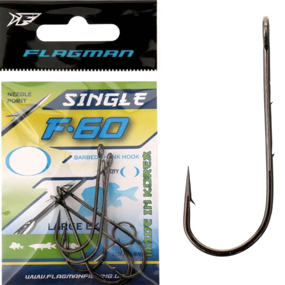 Flagman Single F-60 - серія гачків з двома додатковими насічками на зовнішній стороні цівки. Насічки (борідки) створені спеціально для фіксації приманки. Завдяки такій силі зацепу приманка ніколи не зірветься з гачка, навіть під час агресивного клювання хижака (окуня, судака або щуки). Гачки виготовлені в Кореї, володіють високою якістю, а також задовольняють найжорсткіші вимоги виробництва. Серія відрізняється великим вушком, подовженою цівкою і надгострим жалом, що гарантує відмінне клювання і ідеальну підсічку риби. Одинарні рибальські гачки з великим вушком вкрай ефективні в шарнірних оснащеннях, особливо під час ловлі на мікроджиг. До того ж, антикорозійне покриття (Black Nickel) захищає метал і не дає відблисків в воді. Залежно від габаритів риби, на яку планується полювання, можна підібрати гачок потрібного розміру.