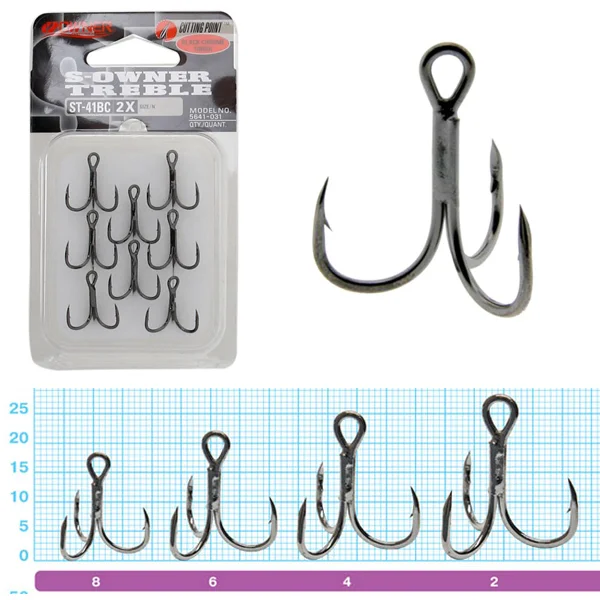 Трійники Owner 2X 5641-ххх - одні з найпотужніших і найнадійніших трійників, що випускаються Owner. Виготовлені з дуже міцного дроту, що пройшов спеціальну технологічну обробку. Характеризуються круглим загином, трохи вкороченою цівкою і найдосконалішою на сьогодні заточкою жала Cutting Point. Можуть використовуватися для риболовлі як у прісній, так і солоній воді.