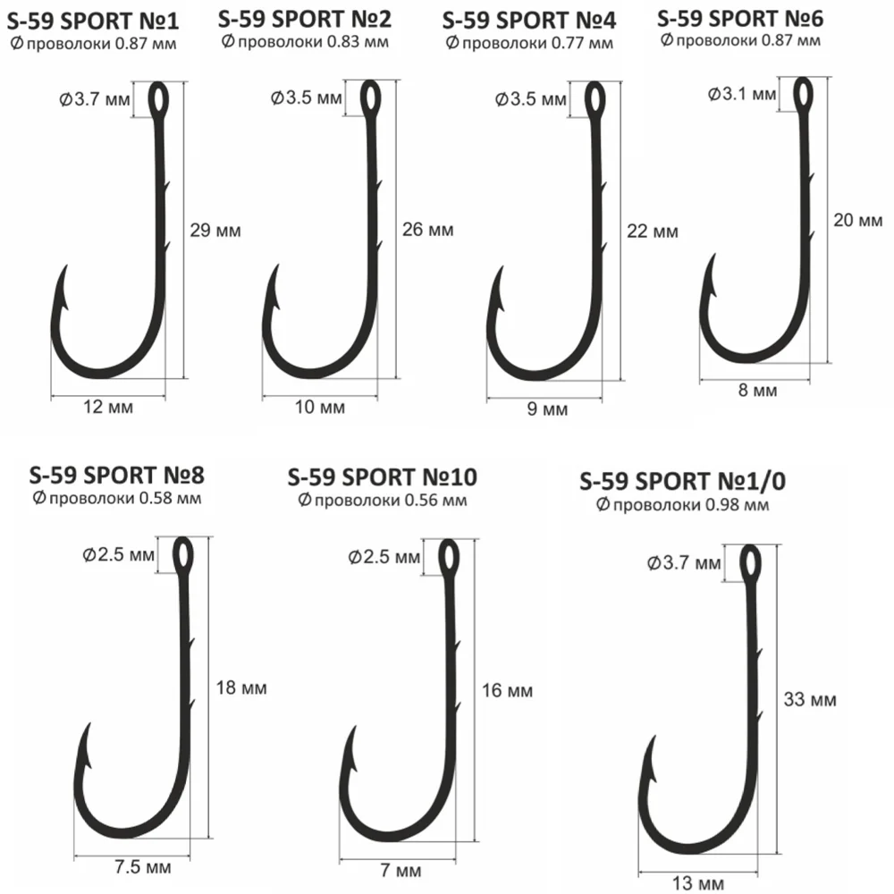 Спортивний рибальський гачок DS (S-59 Sport hook) має надзвичайно високі характеристики міцності. Виготовлений з особливої високовуглецевої сталі, виробленої в Кореї, який не поступається аналогам від японських іменитих виробників. Гачок має ряд своїх особливостей. Жало у гачка вкрай гостре, так як має спеціальну заточку. Гачок S-59 SPORT має збільшене вушко, що робить його максимально рухомим в монтажі, і як результат, гра нанизаної приманки виглядає більш природно. Варто також відзначити цівку з двома зазубринами (бейтхолдер), що дозволяють міцно утримувати силіконову приманку, не допускаючи зісковзування і провертання. S-59 Sport від Дніпро-Свинець надійний для спортивного лову хижої риби і має спеціальне антикорозійне покриття, чорний хром, що дозволяє надовго зберегти його якість навіть в солоній воді.