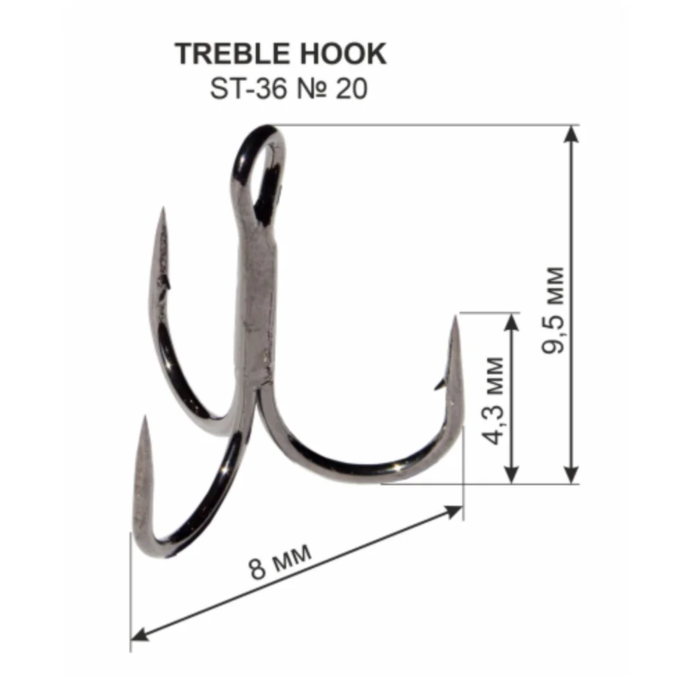 Потрійний гачок ST-36 DS (treble hook) виготовлений в Японії з високовуглецевої сталі. Якісні показники гачка повністю збалансовані, він і пружний, і чудово жорсткий, що дає успішні результати при підсіканні хижака. Снасть, на якій використовується класичний трійний гачок, показує максимально високий результат в фіксації риби на гачку. Ідеально зтаким гачком поєднується грузило головка штопор з оснащеним силіконом. Трійниками зазвичай оснащують воблери, блешні і силіконові приманки. Даний тип гачка має спеціальне антикорозійне покриття, чорний хром, що дозволяє довго зберігати якість гачка навіть в солоній воді.