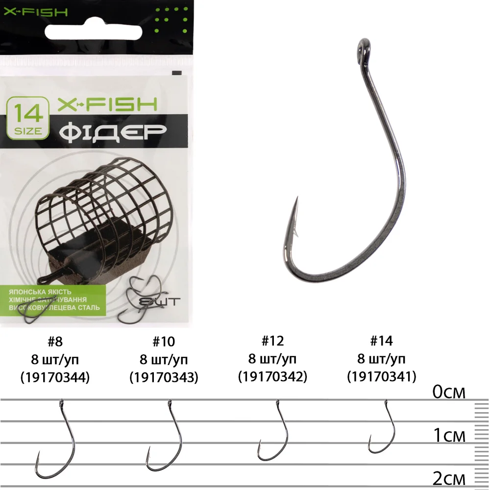 Гачок X-Fish Фідер – серія моделей класичної конструкції. Адаптовані для лову на фідерні оснастки. Популярна форма добре зарекомендувала себе при лові різноманітної мирної риби. Для оптимального вибору гачка під особливості лову, такі як тип насадки або наживки, розміри очікуваних особин і деякі інші, модельний ряд представлений декількома розмірами. Ці гачки чудово впораються із завданням ефективного підсікання та надійного утримання у процесі виведення трофея. Гачок X-Fish Фідер – вдалий вибір для досвідчених рибалок.
