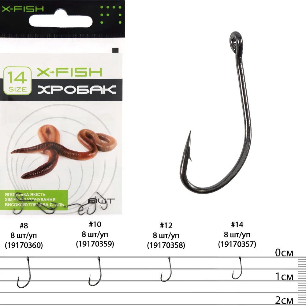 Гачок X-Fish Черв'як – серія моделей з подовженою цівкою, завдяки чому вони найбільш зручні для насаджування дощових хробаків п'явок та інших подібних об'ємних наживок при лові на донні або поплавцеві оснастки. Особлива увага приділена формі та товщині дроту, завдяки чому насадки оптимально розташовуються на гачку, мають природний зовнішній вигляд, а наживки довше залишаються живими та приваблюють рибу своїм власним рухом. Для оптимального вибору гачка під особливості лову, такі як габарити або кількість насадок або наживок, розміри очікуваних особин і деякі інші, модельний ряд представлений декількома розмірами. Ці гачки чудово впораються із завданням ефективного підсікання та надійного утримання у процесі виведення будь-яких видів мирної, всеїдної та хижої риби. Гачок X-Fish Хробак – вдалий вибір для досвідчених рибалок.