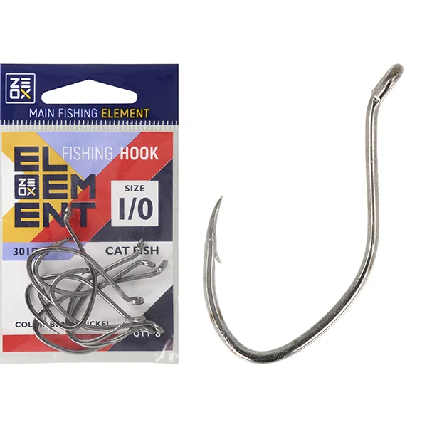 Zeox Cat Fish - спеціалізований гачок для лову сома. Має величезний запас потужності завдяки товстому дроту і форму, яка відмінно утримує рибу на гачку, а також досить універсальний по насадках і наживках. Додаткове посилення забезпечується кованим підчепом. Хімічна заточка жала забезпечує чудову гостроту і, як наслідок, відмінну засікаємість. Покриття Black Nickel запобігає передчасній корозії. Випускається в великих розмірах від 1/0 до 6/0.