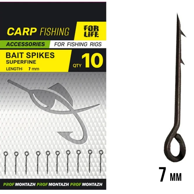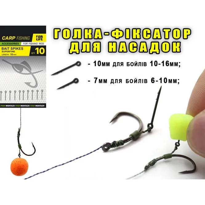 Голка-фіксатор для насадок Bait Spikes 10мм - ідеальне рішення для швидкого кріплення або заміни насадок. Голка відрізняється малою вагою, вона не помітна для риби та відмінно утримує насадку на закиді. Використовується для плаваючих насадок pop-ups, штучної кукурудзи, бойлів з нейтральною плавучістю, balance, dumbells, wafters і.т.д. Використання такої голки особливо актуальне разом з мініатюрними насадками, при насаджуванні такі насадки не розколюються та мають привабливий вигляд для риби. Голка 10мм ідеально підходить для насадок розміром 8-14мм.