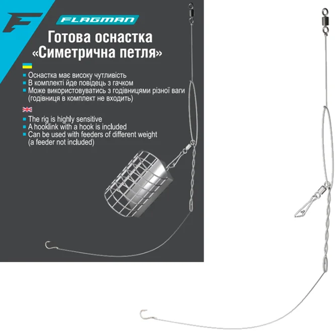 Готову оснастку Flagman «Симетрична петля» призначено для фідерної ловлі активної риби як на течії в річках і водосховищах, так і у водоймах зі стоячою водою. Монтаж «Симетрична петля» є одним з основних і найбільш популярних у класичній фідерній ловлі. Його виготовлено з високоякісної жорсткої жилки діаметром 0,4 мм. Він має високу стійкість до абразиву й міцність на вузлах, не схильний до заплутування та дозволяє використовувати годівниці вагою до 150 г. Повідець завдовжки 50 см виготовлено з високоякісної жилки 0,16 мм та оснащено найгострішим японським гачком № 12, що забезпечує відмінне засікання та надійне утримання риби під час виважування.