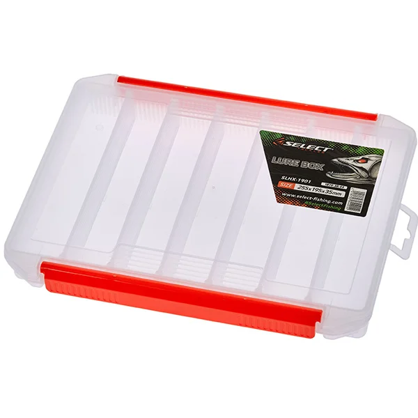 Коробка Select Lure Box максимально пристосована для зберігання приманок та рибальських аксесуарів. Для її виробництва використано практичний пластик, який витримує деякі ударні навантаження і не вступає в реакцію з різними силіконами. Широкий асортимент моделей різних габаритів і комбінацій внутрішніх осередків, допоможе підібрати коробку для зберігання приманок практично будь-якого розміру. Коробка Select Lure Box SLHX-1901 має середні розміри і розрахована на зберігання приманок загальною довжиною до 160 мм. Її особливістю є те, що кришка з двох сторін оснащена широкими застібками, що дозволяють відкривати її праворуч і ліворуч, як зручно буде рибалці. Внутрішній простір є рівним майданчиком, який можна розділити на поперечні відсіки наявними перегородками. Така конструкція дозволяє розміщувати як вузькі, так і ширші приманки і раціональніше використовувати весь внутрішній простір.