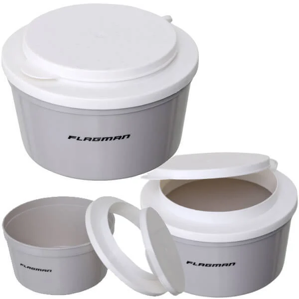 Кругла коробка з кришкою, що щільно закривається, для зберігання опаришів та іншої наживки. Завдяки кришці з отворами наживка "дихає". Спеціальний пластик, з якого виконано коробку, легко миється. Коробка конструктивно складається з двох частин, що розділяються, що також полегшує її миття. Важливо, що кришка з одного боку прикріплена до коробки — гнучкий пластиковий фіксатор перешкоджає втраті кришки. Flagman пропонує коробки для наживки різної ємності на вибір.