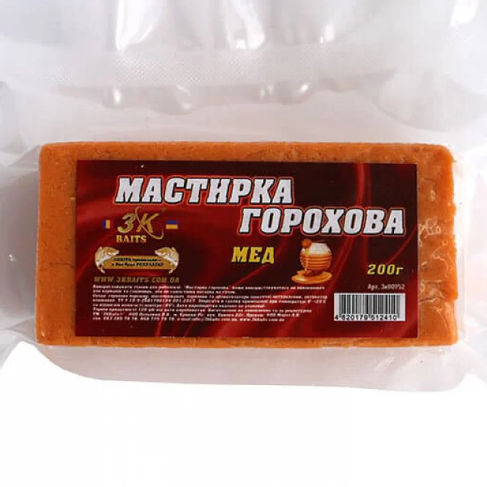 "Мастирка горохова (мед), 200г " - готова універсальна прикормка для будь-якої білої, мирної риби. Завдяки своїй структурі, горохова мастирка може застосовуватись і як насадка на гачок і як наповнювач в годівницю або пружину. Мастирку можливо застосовувати в будь-яку пору року, так як вона ефективна і в холодній, і в теплій воді.