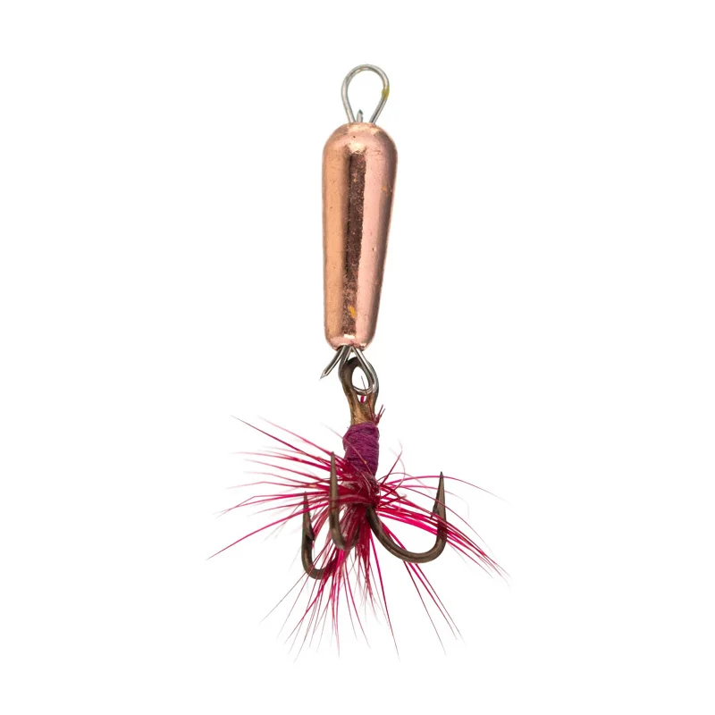 Безнасадкова вольфрамова блешня «Чортик» з підвісним трійником та мушкою з півнячого пера. Імітує природний корм підводних жителів прісних водойм – личинки бабок та інших комах. До жилки приманка кріпиться за петельку у верхній своїй частині, тому приймає у воді вертикальне положення. Ефективна як за активної, і за повільної гри. Вдало «ловить» окуня, плітку, густеру та ляща. Виготовляється в найбільш затребуваних кольорах і розмірах.