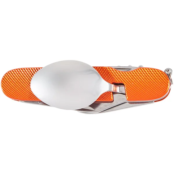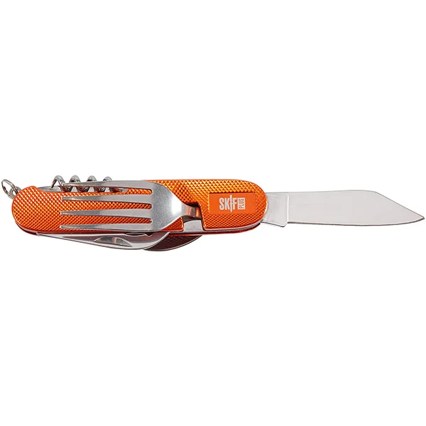 Skif Plus Luncher — невеликий багатофункціональний ніж, доповнений корисними інструментами для виконання щоденних завдань. Інструменти виконані з нержавіючої сталі марки 420, яка має високу в'язкість і стійка до ударних навантажень. Рукоятка виготовлена з алюмінію. Завдяки невеликим розмірам та вазі, його можна носити в кишені, в сумці або рюкзаку і він завжди буде під рукою. Інструменти: 1. Клинок; 2. Ложка; 3. Виделка; 4. Відкривачка для пляшок; 5. Консервний ніж; 6. Шило; 7. Штопор; 8. Кільце для ключів; Довжина загальна, мм: 109 Ножі та холодну зброю: Мультітули (багатофункціональні інструменти) Тип замку: Slip Joint Довжина клинка, мм: 60 Упаковка: Коробка Країна виробник: Китай Тип ріжучої кромки: Звичайна кромка Країна походження: Україна Обробка клинка/Покриття: дзеркальне Маса, г: 145 відкривання ножа: Виїмка для нігтя Марка сталі/Матеріал клинка: 420 Матеріал накладки/рукояті: Алюміній