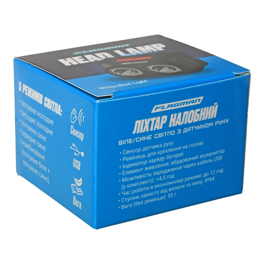 Flagman Head Lamp White+UV (Purple) – акумуляторний налобний ліхтар із сенсором та 5 режимами роботи, серед яких безпечне світло UV (Purple) з довжиною хвилі 395 нанометрів, що дає змогу чітко виділити в темряві предмети з флуоресцентними властивостями: поплавці та квівертипи, окрашені флуоресцентними фарбами, жилки, шнури із флуоресцентним покриттям, грошові банкноти тощо. Світлодіодний ліхтар Flagman F0020094 – це досить потужний і компактний освітлювальний прилад, призначений для використання на риболовлі, полюванні, у кемпінгу, туризмі, під час роботи в темних приміщеннях, а також в аварійних ситуаціях. Він обладнаний джерелами LED-освітлення та має 5 режимів роботи: потужне холодне світло, середнє холодне, потужне синє світло (UV Purple), середнє синє та комбіноване світло (потужне холодне + потужне синє). Живлення налобного ліхтаря Flagman Head Lamp White+UV здійснюється від вбудованого Li-Ion акумулятора. За невеликої ваги в 55 г час роботи виробу становить до 12 годин в економному режимі. Також у конструкції ліхтаря передбачено сенсор руху, що допомагає вмикати/вимикати ліхтар і контролювати його режими жестами рук, а також кріплення для еластичного ременя зі змінним кутом нахилу. Характеристики налобного ліхтарика Flagman Head Lamp White+UV (Purple): П'ять режимів роботи Сенсор руху Елемент живлення: вбудований Li-Ion акумулятор Зарядка за допомогою кабелю USB: близько 4,5 годин Час роботи в економному режимі: до 12 годин Компактні розміри Вага (без ременя): 55 г Ступінь захисту від вологи та пилу: IPX4 Комплектація: еластичний ремінь, зарядний кабель USB