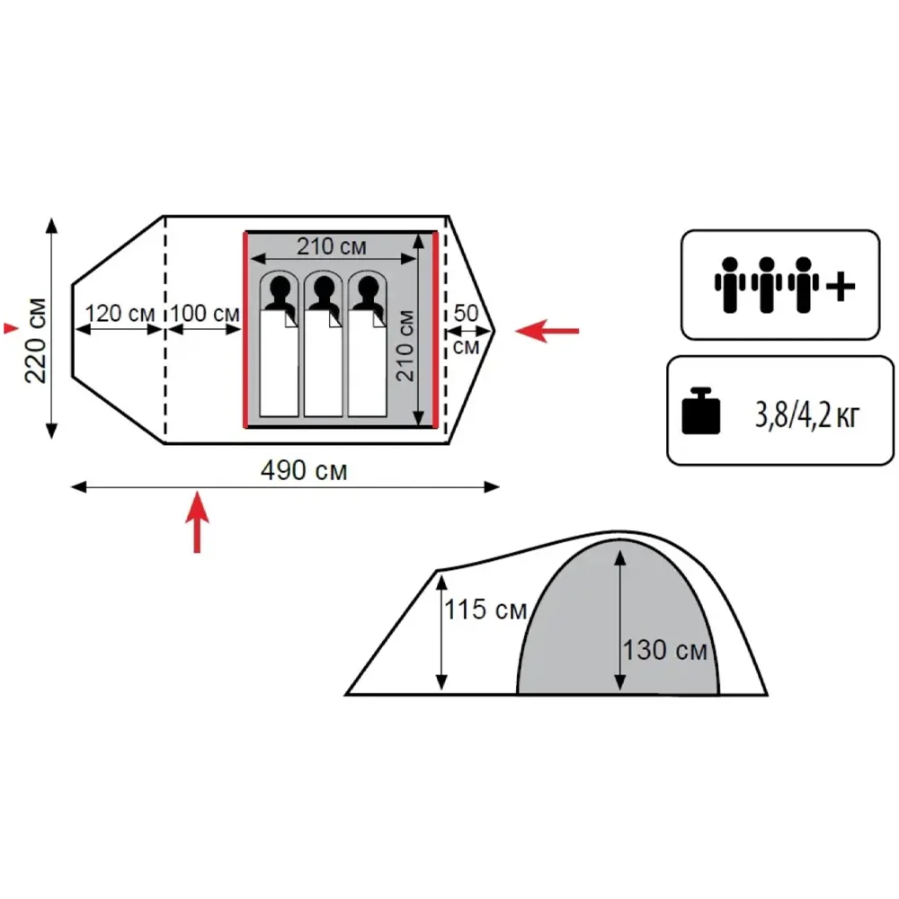 [video link="NXZFow5RyiU"] Тримісний туристичний намет Tramp Lite Twister 3 з трьома входами: два через просторий збільшений тамбур і один через задню торцеву стіну. Відмінна вентиляція і великий об'єм спального відсіку, в якому можуть розташуватися до 4 людей. Час використання: з травня по вересень. Призначення: аматорський туризм, риболовля та відпочинок на природі. Особливості: Двошаровий намет з трьома входами Входи спального відділення продубльовані москітною сіткою Два входи в тамбур Величезний тамбур Два вентиляційних клапани Всі шви проклеєні Ідеальний для туристичних походів у весняну, літню та осінню пору Характеристики: Вага: 4,2 кг Тент: 100% поліестер 75D/190T WR PU 4000 мм в. ст. Внутрішній намет: 100% дихаючий поліестер Дно: армований терпаулинг 10000 мм в. ст. Каркас: фіберглас 7,9 мм Розмір: 490 х 220 х 130 см Розмір в упаковці: 18 x 57 x 17 см Колір тенту: пісочний