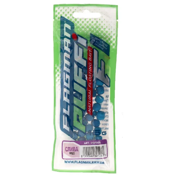Flagman Puffi - серія яких приманок на основі натурального тіста з добавкою різноманітних ароматів. Відрізняється високою плавучістю і добре помітна у воді. Приманка є ароматизованими кульками, які легко насаджуються на рибальський гачок і у воді приймають м'яку консистенцію. При цьому вони досить довго тримаються на гачку, не розкисаючи і не розвалюючись. Завдяки своїм смаковим якостям та запаху насадка добре приваблює представників коропових. Тим більше, що в серії Puffi mini є улюблені коропові аромати - Аніс, Часник, Ваніль, Мед, Слива, полуниця. Вага упаковки - 15г.
