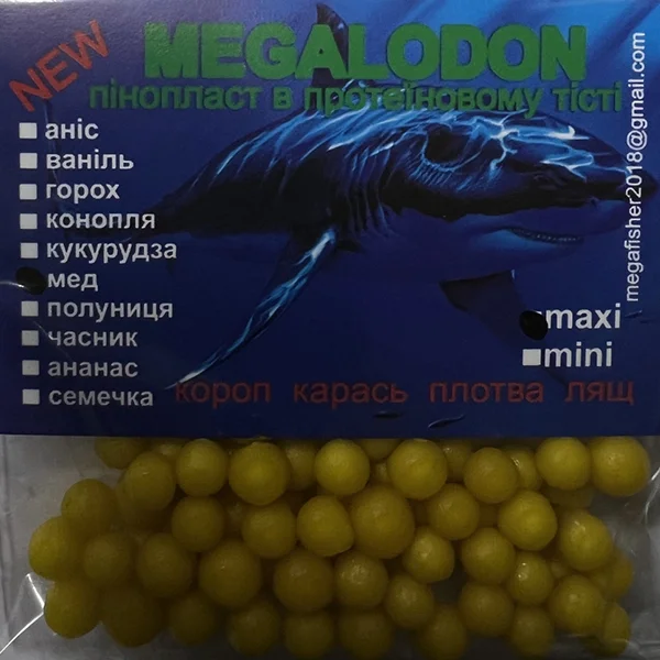 Пінопласт в протеїновому тісті Megalodon поєднує позитивні властивості кульок з пінопласту - хорошу міцність, створює ефект, що палить, і відмінні смакові якості пінотесту, що при грамотному застосуванні дозволяє отримувати кращий результат. Додається впевненість у цілості наживки та збільшується корисне знаходження снасті у воді. Впевнено розуміючи, що насадка на місці і не з'їдена дрібною рибою, можна сміливо чекати на клювання карася або плотви, ляща,коропа. Так як такі насадки часто застосовують на пружинах, сосках, які вимагають не дуже частого перезакидання.