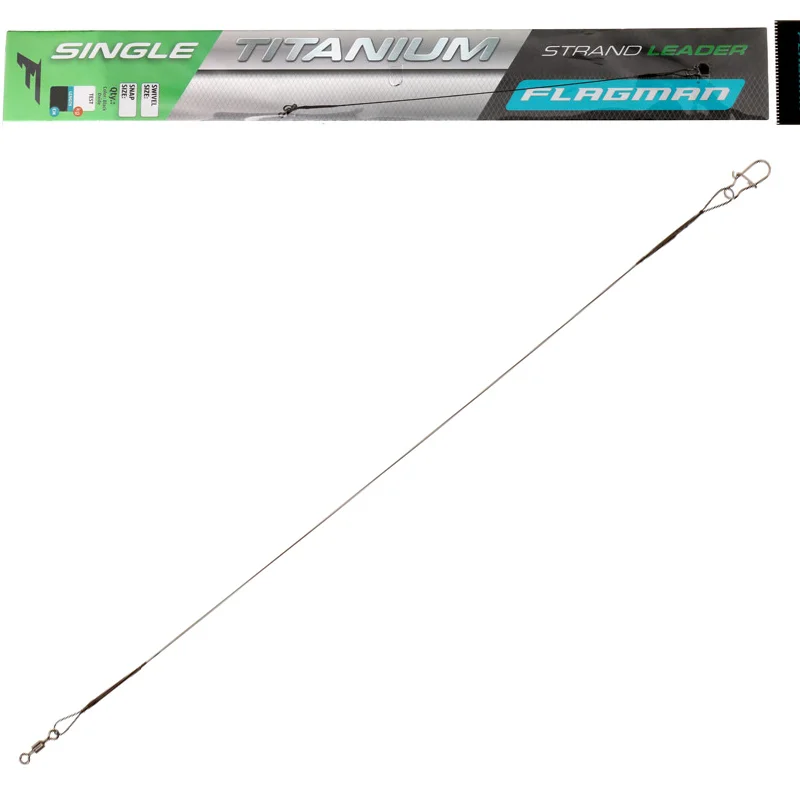 Flagman Titanium — надзвичайно міцний і тонкий повідець з титану, оснащений вертлюгом і застібкою. Завдяки темному покриттю(оксидуванню) титановий повідець малопомітний в товщі води. У спінінговій ловлі використовується з блешнями, воблерами, силіконовими приманками. Flagman пропонує широкий вибір повідців з титану різної довжини(15, 20 і 25 см), з різним тестом, з різними розмірами вертлюгів і застібок. Тип — моно Матеріал — титан Колір — Black