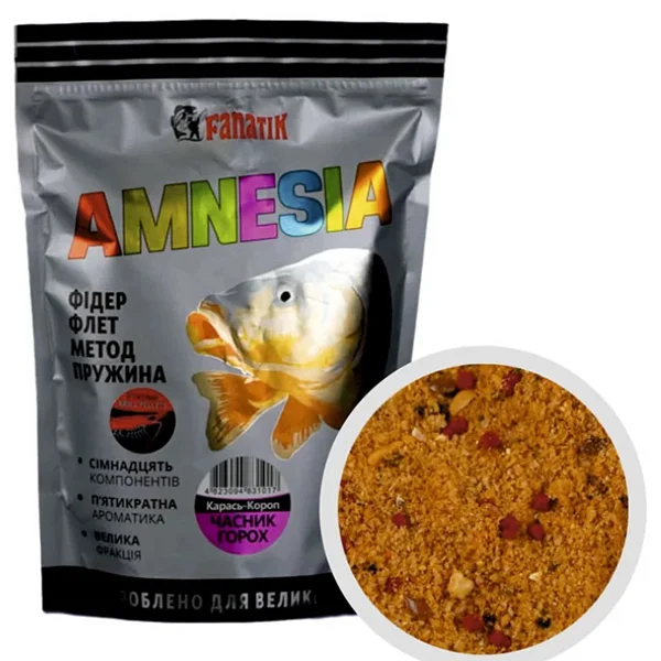 Складається виключно с преміальних інгредієнтів. У складі прикормки знаходиться сімнадцять високоякісних складових і п’ятикратна концентрація смаку. В кожному складі знаходяться високопротеїнові компоненти вищого сорту. Головна фішка прикормок «Амнезія» - це крилевий пелетс власного виробництва, який додається у двох розмірах і кольорах. Прикормка крупно-фракційна та універсальна до будь-яких температурних і сезонних умов. Склад прикормки «Амнезія» розрахований на рибу середнього і великого розміру, яка природньо відчуває своїми рецепторами смак першокласних складових. Завдяки правильній пропорції різної фракції - «Амнезія» приваблює рибу внаслідок своєї механіки, при цьому гарно ліпиться і працює відразу, коли потрапляє у воду. Амнезія використовується при всіх способах ловлі мирної риби Якщо Ви націлені на очікування крупної риби, ми рекомендуємо перезволожувати прикормку, при цьому її робота не менш приваблива, але починається трохи пізніше, тим самим не дає можливості швидко виїдати її дрібній рибі. Це прикорм шарами, які рівномірно розпадаються після потрапляння в місто ловлі, як при стандартному замішуванні, так і в перезволожувальному. Любителі ловлі на флет також будуть вражені працездатністю прикормки, яка гарно розстилається навколо флета. Ловля на класичні годівниці з «Амнезією» більш успішна, тому, що завдяки нашому фірмовому пелетсу з крилевої муки - корм поступово сиплеться з годівниці та дає можливість дочекатися свого трофею. На наш погляд самим ефективним і універсальним способом є використання Амнезії з годівницею Капля-соска. В цьому році вона є у двох розмірах. Її форма дозволяє працювати прикормці дуже привабливо й ефективно. Мала витрата прикормки; Цікавий підйом корма з контейнера – залишається в годівниці поруч з вашою насадкою, краще за всього працює з насадкою Водограй.