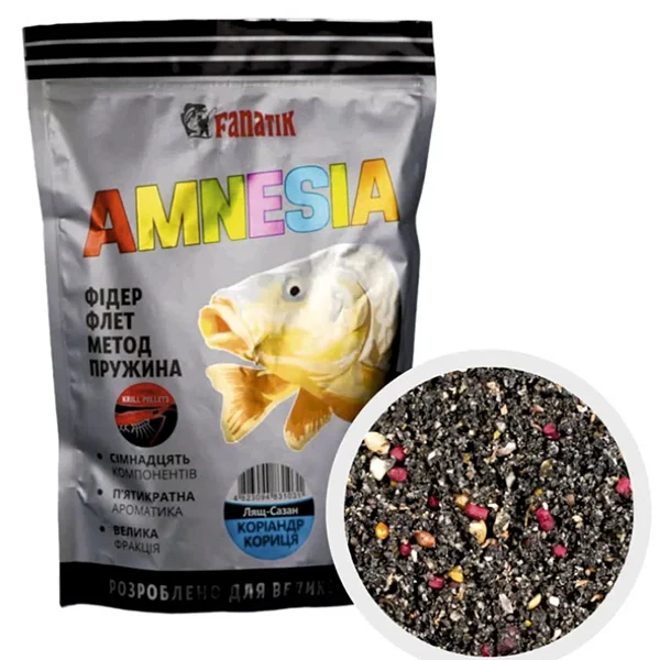 Складається виключно с преміальних інгредієнтів. У складі прикормки знаходиться сімнадцять високоякісних складових і п’ятикратна концентрація смаку. В кожному складі знаходяться високопротеїнові компоненти вищого сорту. Головна фішка прикормок «Амнезія» - це крилевий пелетс власного виробництва, який додається у двох розмірах і кольорах. Прикормка крупно-фракційна та універсальна до будь-яких температурних і сезонних умов. Склад прикормки «Амнезія» розрахований на рибу середнього і великого розміру, яка природньо відчуває своїми рецепторами смак першокласних складових. Завдяки правильній пропорції різної фракції - «Амнезія» приваблює рибу внаслідок своєї механіки, при цьому гарно ліпиться і працює відразу, коли потрапляє у воду. Амнезія використовується при всіх способах ловлі мирної риби Якщо Ви націлені на очікування крупної риби, ми рекомендуємо перезволожувати прикормку, при цьому її робота не менш приваблива, але починається трохи пізніше, тим самим не дає можливості швидко виїдати її дрібній рибі. Це прикорм шарами, які рівномірно розпадаються після потрапляння в місто ловлі, як при стандартному замішуванні, так і в перезволожувальному. Любителі ловлі на флет також будуть вражені працездатністю прикормки, яка гарно розстилається навколо флета. Ловля на класичні годівниці з «Амнезією» більш успішна, тому, що завдяки нашому фірмовому пелетсу з крилевої муки - корм поступово сиплеться з годівниці та дає можливість дочекатися свого трофею. На наш погляд самим ефективним і універсальним способом є використання Амнезії з годівницею Капля-соска. В цьому році вона є у двох розмірах. Її форма дозволяє працювати прикормці дуже привабливо й ефективно. Мала витрата прикормки; Цікавий підйом корма з контейнера – залишається в годівниці поруч з вашою насадкою, краще за всього працює з насадкою Водограй.