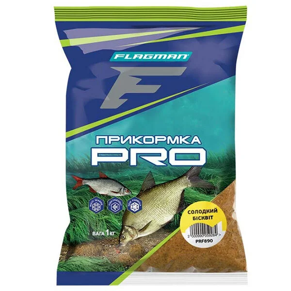 Flagman Pro Солодкий Бісквіт – універсальна прикормочна суміш на основі бісквіту, яку призначено для фідерної й поплавцевої ловлі риби як у річках із повільною і середньою течією, так і у водоймах без течії. Суміш Flagman Pro Солодкий Бісквіт складається з якісних натуральних компонентів із високою харчовою цінністю для риби. Вона має середню фракцію, середню в'язкість і ніжний смак солодкого бісквіту. Завдяки жовтому кольору створює добре помітну кормову пляму. Маючи середню активність, суміш швидко поширює у воді цінні поживні речовини й насичений аромат, який чудово стимулює апетит риби й спонукає її до активного харчування. Прикормка Flagman Pro Солодкий Бісквіт містить високий рівень натуральних атрактантів, які ефективно приваблюють рибу й тривалий час утримують її на ділянці, яку прикормлено. Прекрасно працює у тандемі з іншими прикормками й ароматами. Абсолютно нешкідлива для риби та решти підводних мешканців.