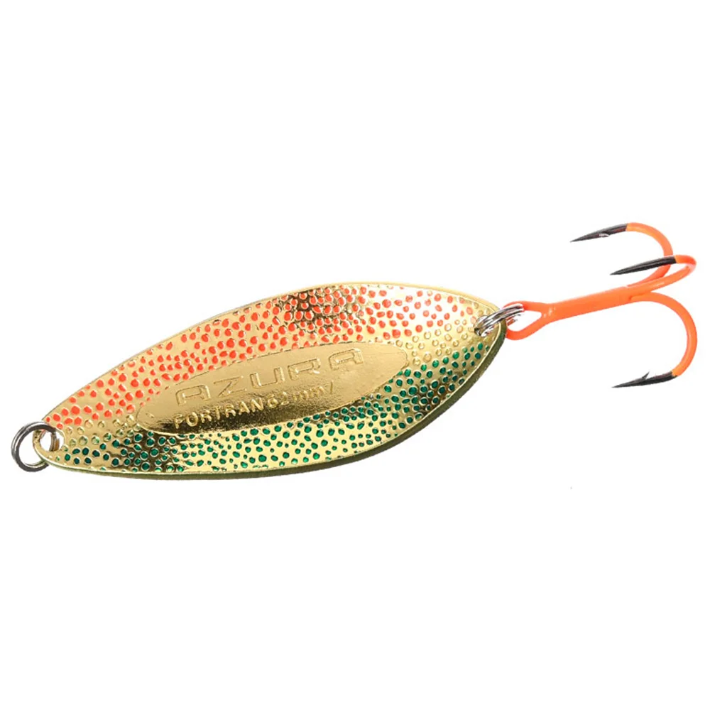 Azura Fortran Flat – серия высокоэффективных колеблющихся блесен, выделяющихся среди прочих классической геометрией и высокой уловистостью. От полюбившейся многим серии Fortran приманки Fortran Flat отличаются более широким телом и выраженным S-образным изгибом. Блесны изготовлены из латуни, имеют многослойное гальваническое покрытие. Благодаря своей форме Azura Fortran Flat обладают активной размашистой игрой даже на небольших скоростях. Приманки отлично держат глубину проводки, имея при этом высокую стабильность игры и отлично показывают себя как на течении, так и в стоячей воде. Колеблющиеся блесны Azura Fortran Flat прекрасно сбалансированы и выделяются хорошими аэродинамическими характеристиками, позволяющими выполнять дальние и точные забросы. Специальное рифление поверхности приманки в виде частых впадин-микроточек создаёт уникальный 3D-эффект объёмного, подвижного и соблазнительно мерцающего тела небольшой рыбки, а также обеспечивает микрозавихрения и турбулентность водного потока вокруг приманки, что привлекает даже самого малоактивного хищника. Каждая блесна Fortran Flat оснащена надёжными заводными кольцами и острейшими тройниками, способными просечь пасть любого трофея. В зависимости от размеров блесны, кроме вездесущей щуки, в вашем улове будут практически все хищники наших вод: форель, крупный окунь, жерех, судак, сом и т.п. Все блесны изготовлены на высокотехнологичном оборудовании, позволяющем добиться 100% повторяемости изделий, и прошли тщательное тестирование профессиональными экспертами компании Azura.