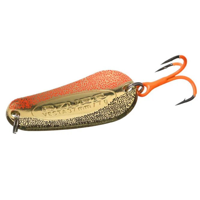 Azura Vesta – настоящий фаворит по ловле хищной и полухищной рыбы. Тело приманки, изготовленное из латуни, имеет небольшие размеры, но довольно высокий удельный вес, что позволяет ловить рыбу на течении и достаточно больших глубинах. При внешне простой форме блесна Azura Vesta отлично держит глубину проводки и обладает уникальной способностью сохранять устойчивость даже на сильном течении. Приманка отлично сбалансирована, выделяется соблазнительной размашистой игрой и прекрасными аэродинамическими характеристиками, позволяющими выполнять дальние и точные забросы. Рифлёная внешняя поверхность создаёт во время проводки мерцающие блики и микрозавихрения воды, вызывающие у хищных рыб неподдельный интерес и провоцируют их на мгновенную атаку. Блесна Vesta оснащена надёжными заводными кольцами и острыми тройниками, способными просечь пасть трофея любой величины. Приманка имеет потрясающую уловистость, что на быстрых, что на медленных проводках, причём, как в условиях быстрых рек, так и на непроточных или слаботекущих водоёмах. В списке её трофеев жерех, голавль, язь, окунь, форель, щука, судак и т.п.