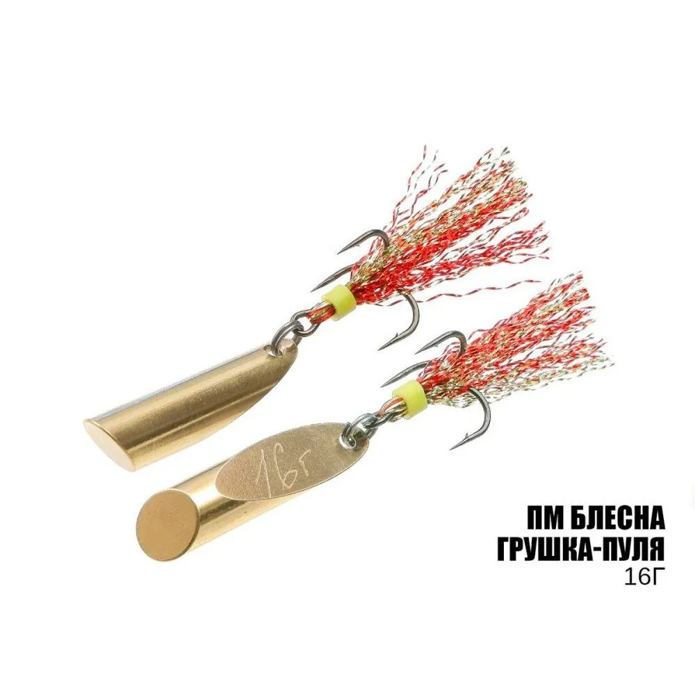 Блесна Грушка-Пуля - очень популярная и уловистая приманка. На нее можно поймать как привычных хищников: судака, щуки, окуня, сома, жереха так и мирных рыб: карпа, карася, толстолоба, леща и.т.д. Грушка-пуля работает в любое время года, потому что подходит не только для охоты по открытой воде, но и зимой, из льда при вертикальной анимации демонстрирует соблазнительную игру. Для избегания запутывания и раскрытия всего потенциала приманки, следует грушку-пулю монтировать, с крючком в положении косого среза на блесне. Изготовляется приманка из латуни, и оснащается качественным тройником с опушкою в виде люрекса, для предоставления объему на каждой блесне люрекс дополнительно рыхлится вручную. Идеально отполированная поверхность блесны блестит в солнечных лучах, что помогает привлечь хищника из большего расстояния. Благодаря двум косым срезам центр тяжести смещен к нижней части, потому Грушка-пуля демонстрирует непревзойденные полетные характеристики. Блесна не прихотлива к стилю анимации, или обычный взброс или ступенчатая проводка красиво провоцируют большинство рыбы, но не забывайте о паузах, большинство клевов происходят именно на дне. Грушка стабильно играет как в стоячем водоеме, так и на течении.