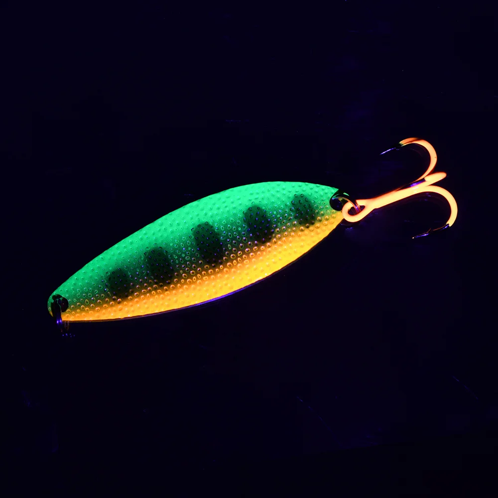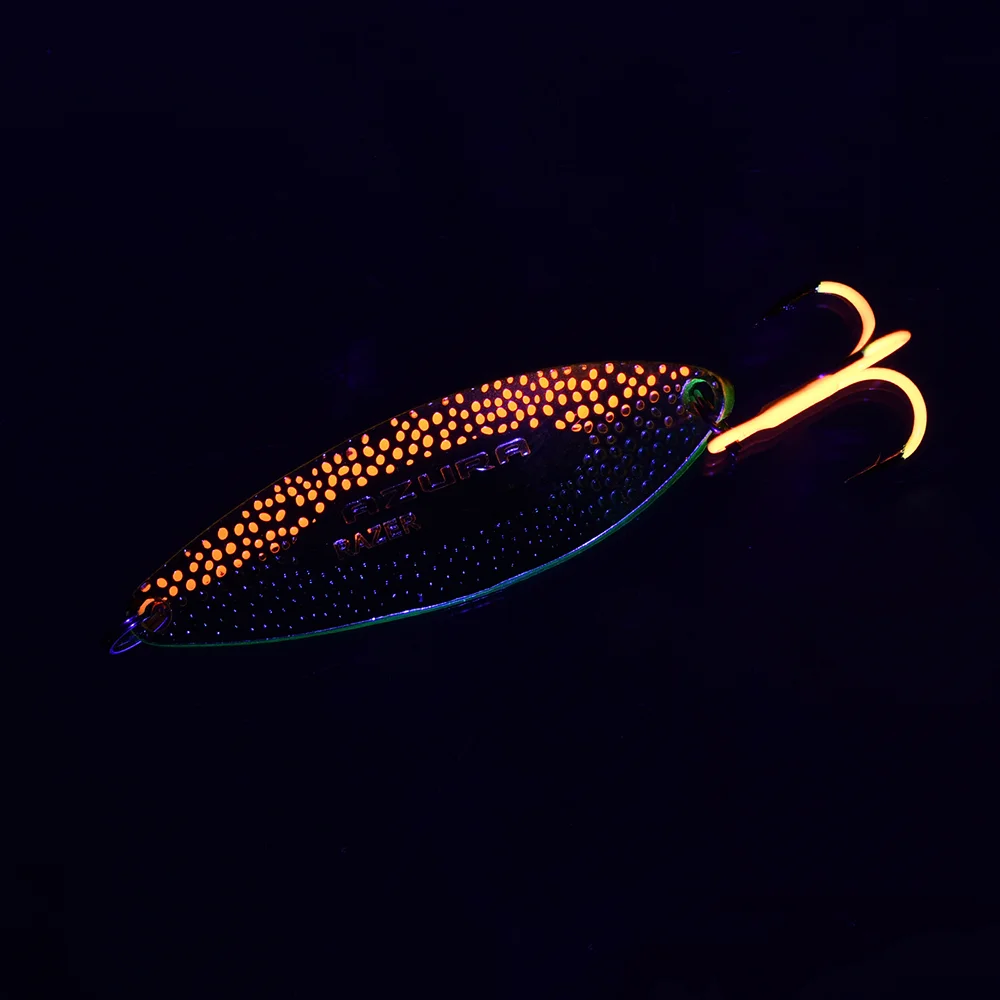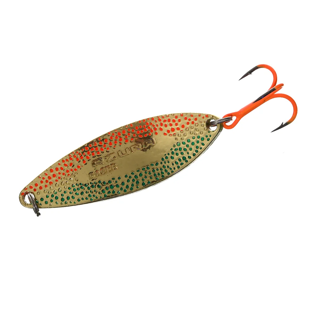 Блесны Azura Razer – серия высококлассных колеблющихся блесен удлинённой зауженной формы, изготовленных из латуни. Благодаря своей форме и уникальному профилю блесна Azura Razer обладает достаточно активной компактной игрой, при которой в основном работает её задняя часть, создавая мощные низкочастотные колебания, привлекательные для любого хищника. Блесна создавалась для ловли на быстрых реках, поэтому прекрасно держит течение, не всплывает на поверхность и отличается высокой стабильностью игры. В то же время заливы рек, озера, протоки и водохранилища без течения также являются вотчиной этой приманки, собирающей и здесь богатую дань! Приманка отлично сбалансирована, отлично держит глубину проводки и обладает невероятными аэродинамическими характеристиками, позволяющими выполнять дальние и сверхдальние забросы, т.е. не только работать по площадям, но и доставать до самой осторожной рыбы. Специфическая рельефная внешняя поверхность блесны не только делает привлекательным её внешний вид, но и создаёт во время проводки мерцающие блики и микрозавихрения воды, вызывающие у хищных рыб оживлённый интерес и провоцирующие их на мгновенную атаку. Блесна очень универсальна и показывает феноменальные результаты уловистости как на медленных и средних, так и на высоких скоростях проводки. В списке её трофеев щука, окунь, жерех, голавль, судак, лосось и прочие хищники. Колебалки Azura Razer – прекрасный пример объединения проверенной временем японской классики и современных технологий. Приманки оснащены надёжными заводными кольцами и острейшими тройниками, доступны в широком спектре уловистых окрасок, в длине 54, 58, 62 мм и развесовке 14, 16, 21 г соответственно.