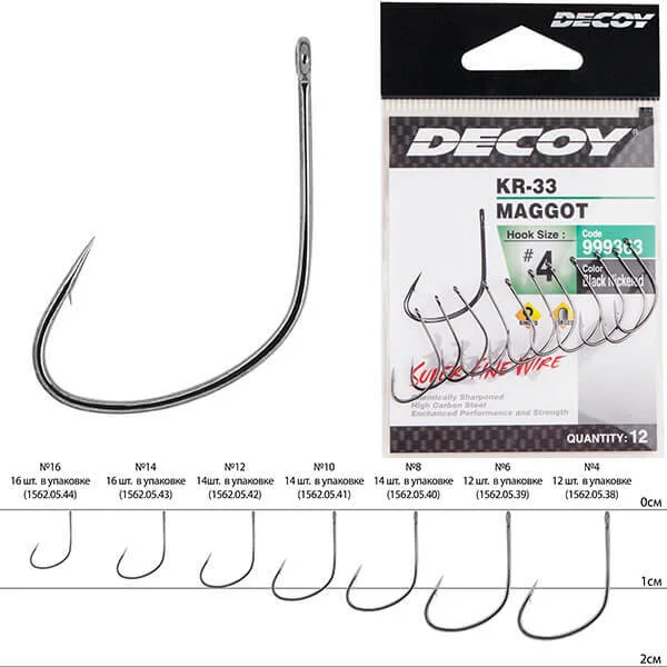 Decoy KR-33 Maggot - является отличным вариантом для поклонников поплавочной и фидерной ловли. Крючок специально разработан для использования в паре с наживками животного происхождения, такими как опарыш, пинок и червь. При производстве используется углеродистая сталь, за счет этого достигается максимальная упругость и прочность продукта. Заточка производится по современной технологии, базирующейся на химико-механическом процессе. Это позволяет изделию длительное время сохранять начальную остроту жала. Для привязывания поводка предусмотрено специальное ушко, благодаря чему нивелируется возможность соскальзывания или перетирания лески в месте крепления.