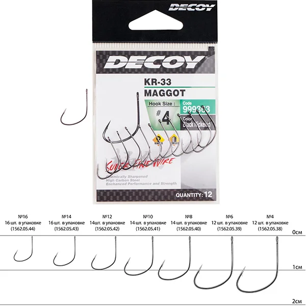 Decoy KR-33 Maggot – является отличным вариантом для поклонников поплавка и фидерной ловли. Крючок специально разработан для использования в паре с наживками животного происхождения, такими как опарыш, пинок и червь. При производстве используется углеродистая сталь, за счет этого достигается максимальная упругость и прочность продукта. Заточка производится по современной технологии, базирующейся на химико-механическом процессе. Это позволяет изделию длительное время сохранять начальную остроту жала. Для привязывания поводка предусмотрено специальное ушко, благодаря чему нивелируется возможность соскальзывания или перетирания лески в месте крепления.