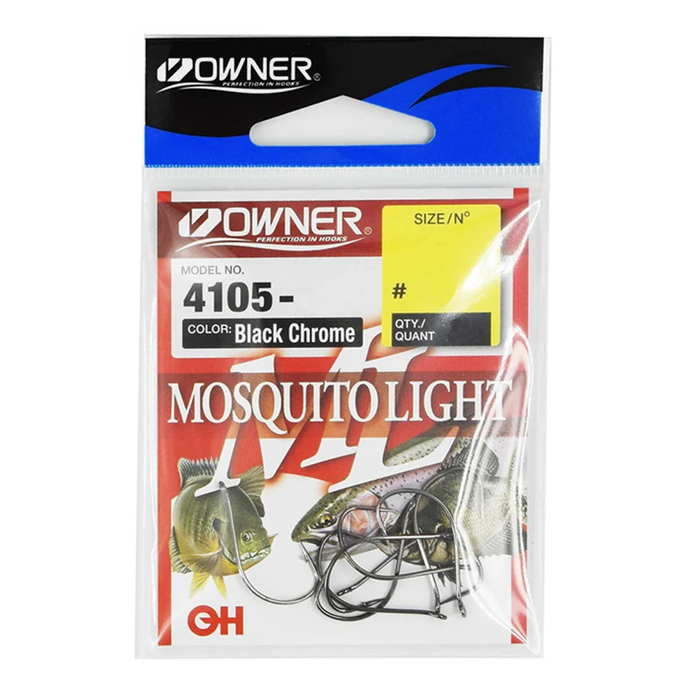 Owner Mosquito Light 4105 – серия многоцелевых крючков с колечком, разработанных для ловли форели и окуня на узкие мягкие приманки или живца. Owner 4105 характеризуются круглым немного отогнутым наружу ушком, средней длины цевьем, прямым жалом с миниатюрной бородкой, кованым поддевом и широким полукруглым изгибом, способствующим лучшему удержанию рыбы, а также защитным покрытием черного цвета. Острейшее жало Owner Mosquito Light с совершенной игольной заточкой и миниатюрная бородка гарантируют не только эффективное просекание костистой пасти, но и минимальное нанесение повреждений подсеченной рыбе.