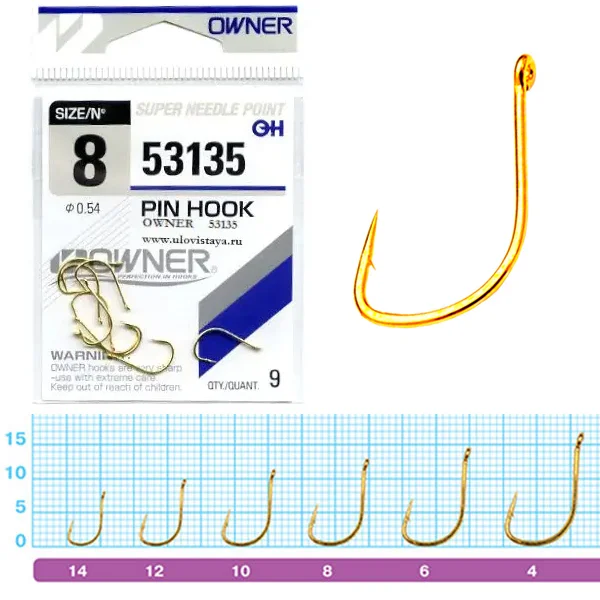 Owner Pin Hook 53135 – пожалуй, одна из самых востребованных серий крючков для поплавковой ловли. Изготовленные из тонкой, но прочной проволоки, крючки обладают следующими параметрами: немного удлиненная струйка; немного скошенный округлый загиб; аккуратное, не травмирующее рыбу, но надежно удерживающее после подсечки жало; удобное колечко для привязки.