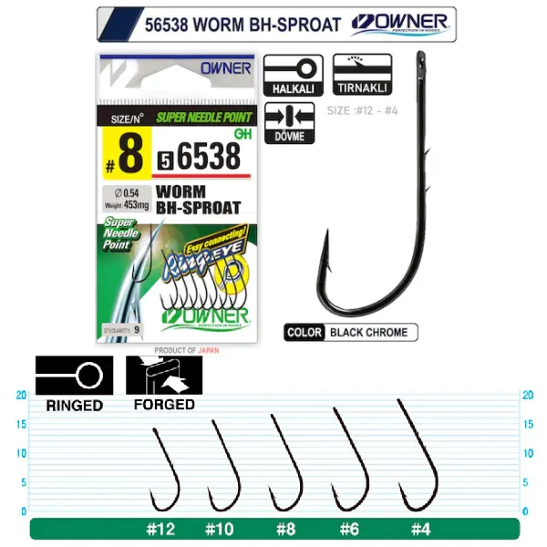 Продолговатый загиб и удлиненная струйка с двумя миниатюрными насечками на нем обеспечивают крючкам Owner Worm Bh-Sproat 56538 равномерное, без сползания, распределение насадки. Кроме того, даже самая «смысловая» рыба не в состоянии безнаказанно стянуть приманку с крючка. Крючки предназначены для широкого использования в различных поплавковых и донных оснастках.