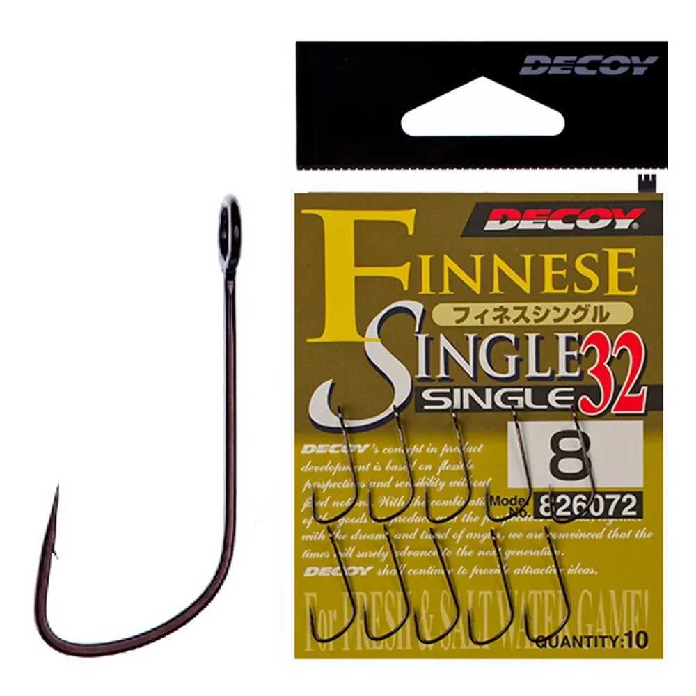 Крючок Decoy Single 32 предназначен для оснащения силиконовых приманок при ловле хищной рыбы. Что примечательно, форма крючка была разработана в сотрудничестве с отечественными рыболовами-спортсменами, которые считаются одними из лучших спиннингистов в мире. Правильно подобранная толщина проволоки и особый изгиб, позволяют приманке лучше удерживаться на крючке и рыбе значительно сложнее стащить её. Также, такая форма способна выдержать большие нагрузки и меньше подвержена разгибанию. Single 32 имеет увеличенное ушко для большей свободы при осуществлении проводки.