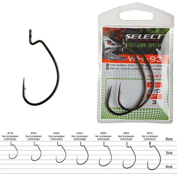 Крючок Select WH-93 – офсетник для оснащения широкотелых силиконовых приманок. Большой радиус изгиба не мешает свободному проникновению жала во время поклевки рыбы. Офсетный крючок выполнен из качественной высокоуглеродистой стали с коваными гранями, благодаря чему выдерживает большие нагрузки и долго сохраняет качественную заточку. Широкий модельный ряд крючков Select WH-93 позволяет подобрать подходящий размер под приманки разной длины.